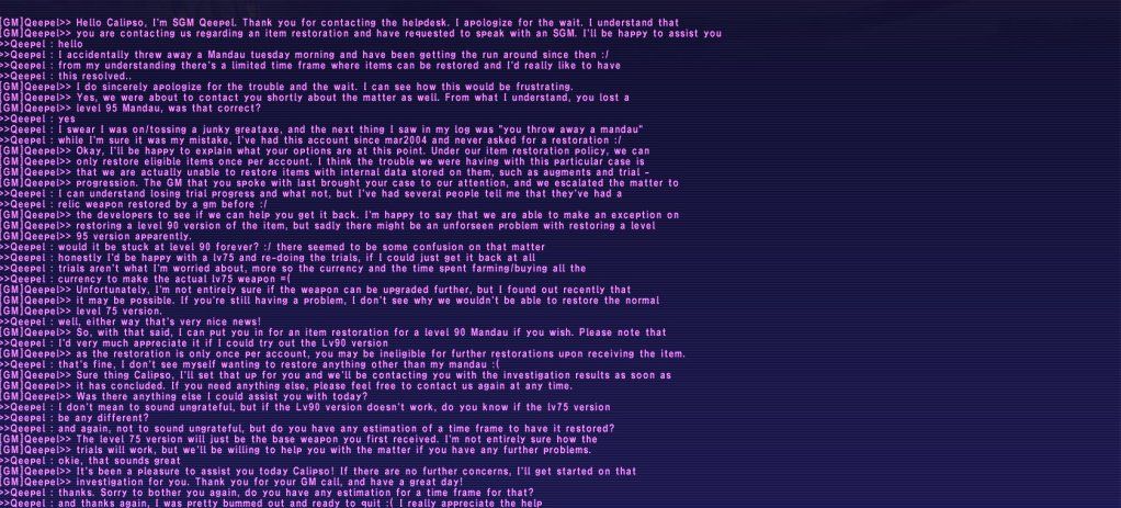 Now, just out of curiosity, if I get the same line from a SGM, how much more should I push to have it restored? There was recently just a case where someone had their Lv90 Almace restored. I don't understand how they can restore an Empyrean weapon, which is nothing but trials from start to end, but not a Relic weapon, which was part of the game YEARS before the concept of magian trials were even in game. I've seen so many lines of "we can't restore this or that" but then someone turns around and posts screenshots of GMS doing exactly what another GM said they couldn't (a restored black belt, A.body abjuration, and recently that almace all come to mind).