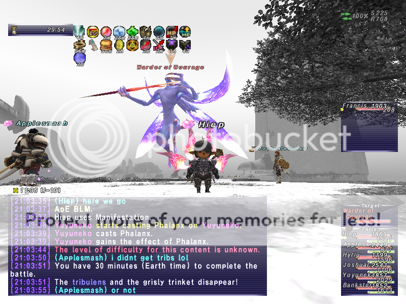 Just popped Warder of Courage and boy we didn't bring lube. Few notes, the fight has a 30 min time limit. It had an extreme amount of MEVA. My nukes did not exceed 1k until Bolster (Non-mythic) Indi-Focus/Geo-Languor was on. Fight went downhill once it started spamming Maiden's Virelai multiple times even after we recovered and re-engaged. We did not try locking out 2Hrs like how it was done back in the day, was mostly a test run. A message popped up "The Warder of Courage readies a magnificent blow!". I wasn't sure if this meant that it job changed because it went from BRD to BLM, then Manafonted/Meteor'd us. Also the wyverns nuked/Mijin Gakured. I wasn't able to sleep the wyverns, however they weren't inside Languor bubble so it may still be possible.